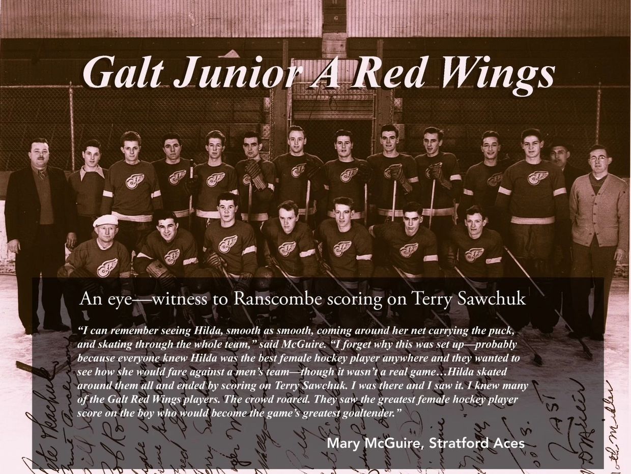 “I can remember seeing Hilda, smooth as smooth, coming around her net carrying the puck, and skating through the whole team,” said McGuire. “I forget why this was set up—probably because everyone knew Hilda was the best female hockey player anywhere and they wanted to see how she would fare against a men’s team—though it wasn’t a real game…Hilda skated around them all and ended by scoring on Terry Sawchuk. I was there and I saw it. I knew many of the Galt Red Wings players. The crowd roared. They saw the greatest female hockey player score on the boy who would become the game’s greatest goaltender.”
